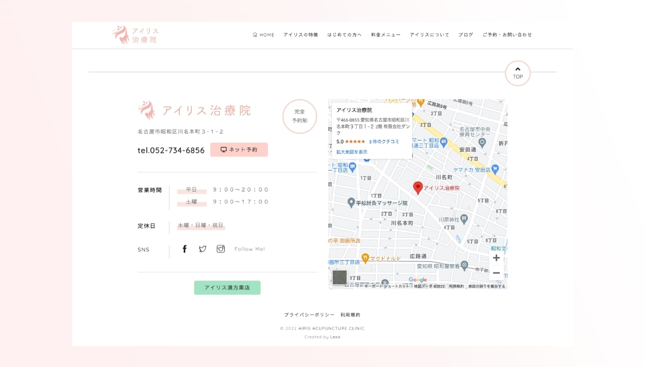 名古屋でこだわりの鍼灸治療を行なっているアイリス治療院様のWebサイトを制作しました。 各ページの一番下に設置されるフッター情報をわかりやすく設置し、直接来院に繋がる為の導線にも配慮したデザインに。新規集客での実績が右肩上がりになっていくようにSEO対策を継続的に実施しています。