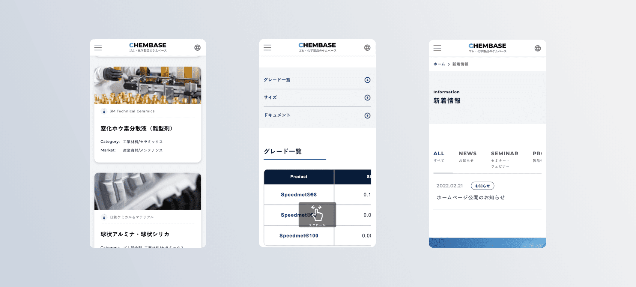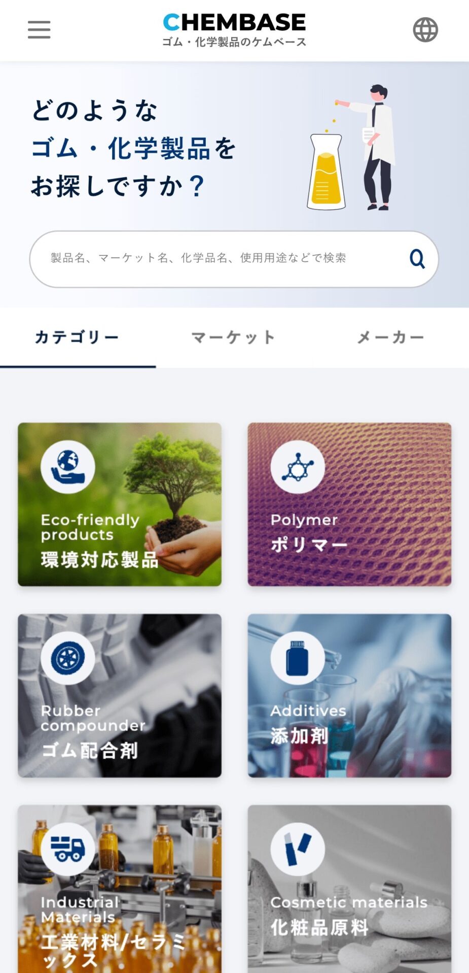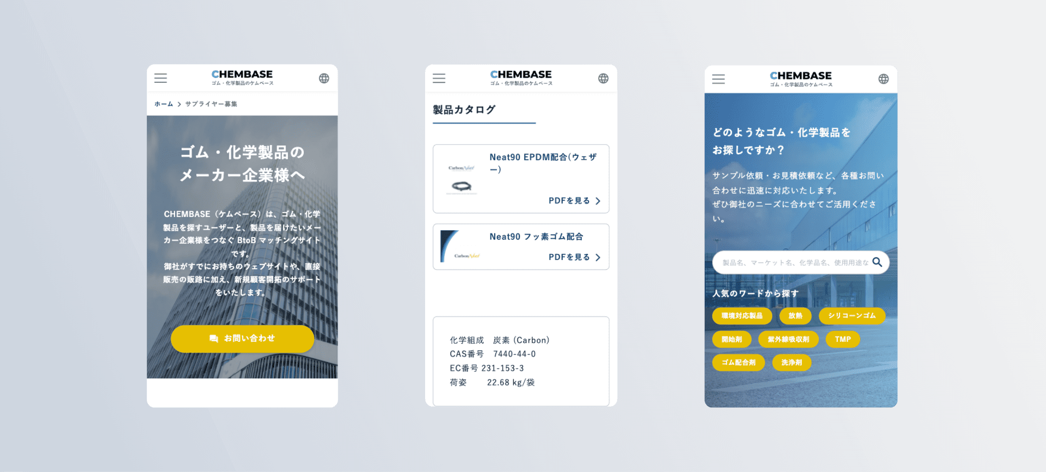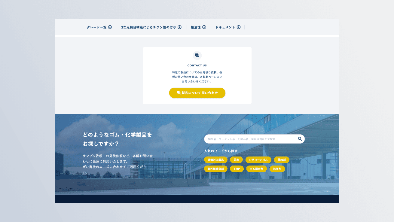 合成ゴム・化学品などの総合専門商社である三洋貿易株式会社様のデータベースサイト「CHEMEBASE(ケムベース)」を制作いたしました。あまり検索サイトに慣れていない方でも見たい情報まで最短距離で辿り着けるよう、並び替えやフリーワード検索など多くの機能に対応。また直感的に必要なデータを探していただけるよう、無駄な装飾は抑え、シンプルさや分かりやすさ、使いやすさを意識しています。