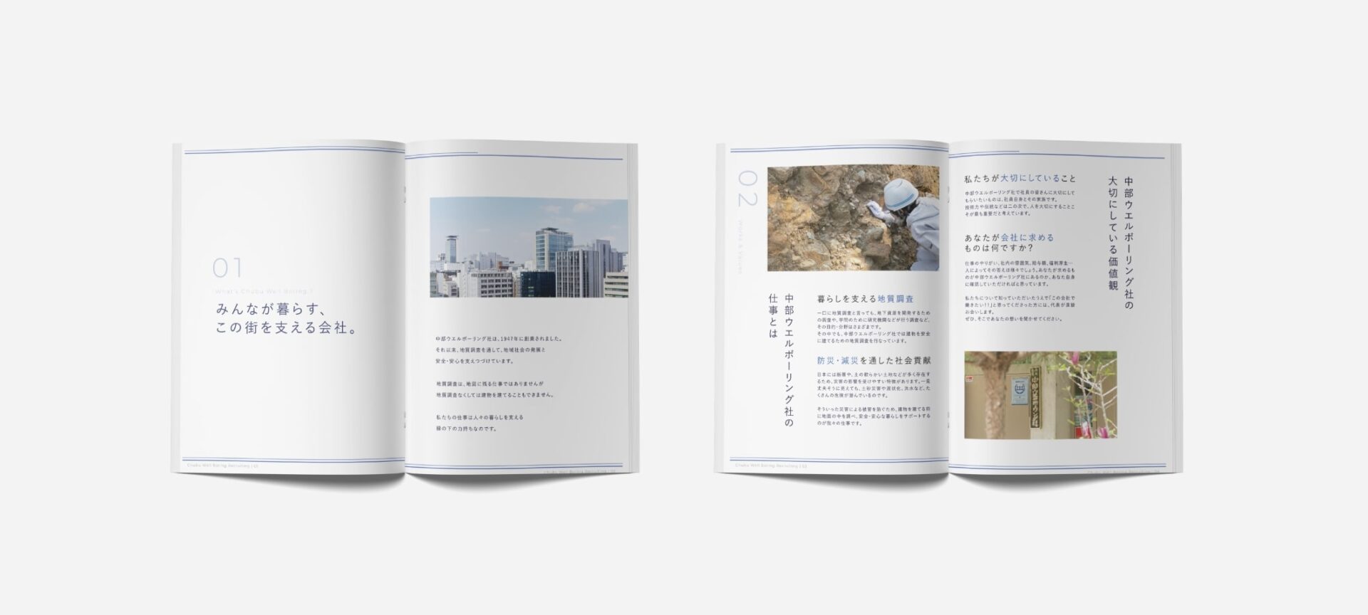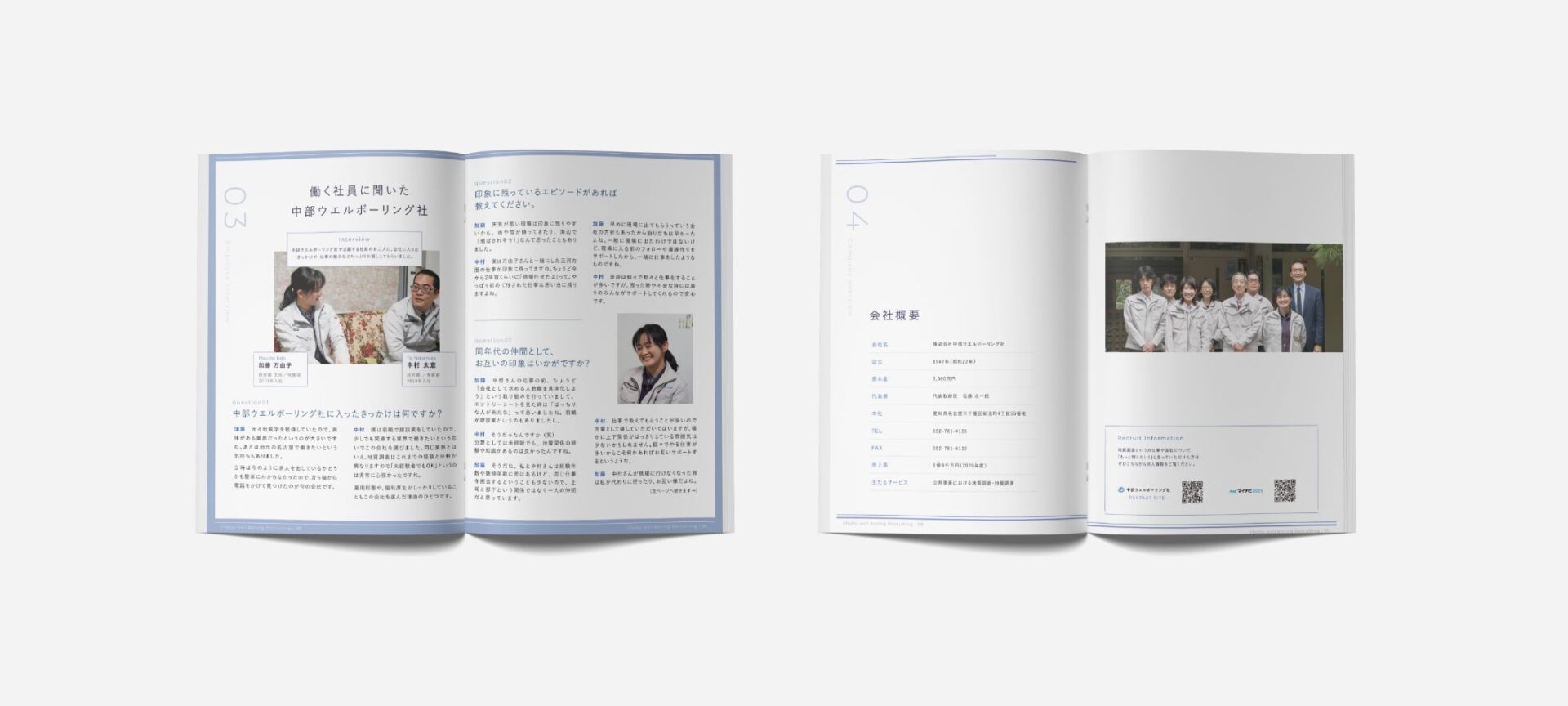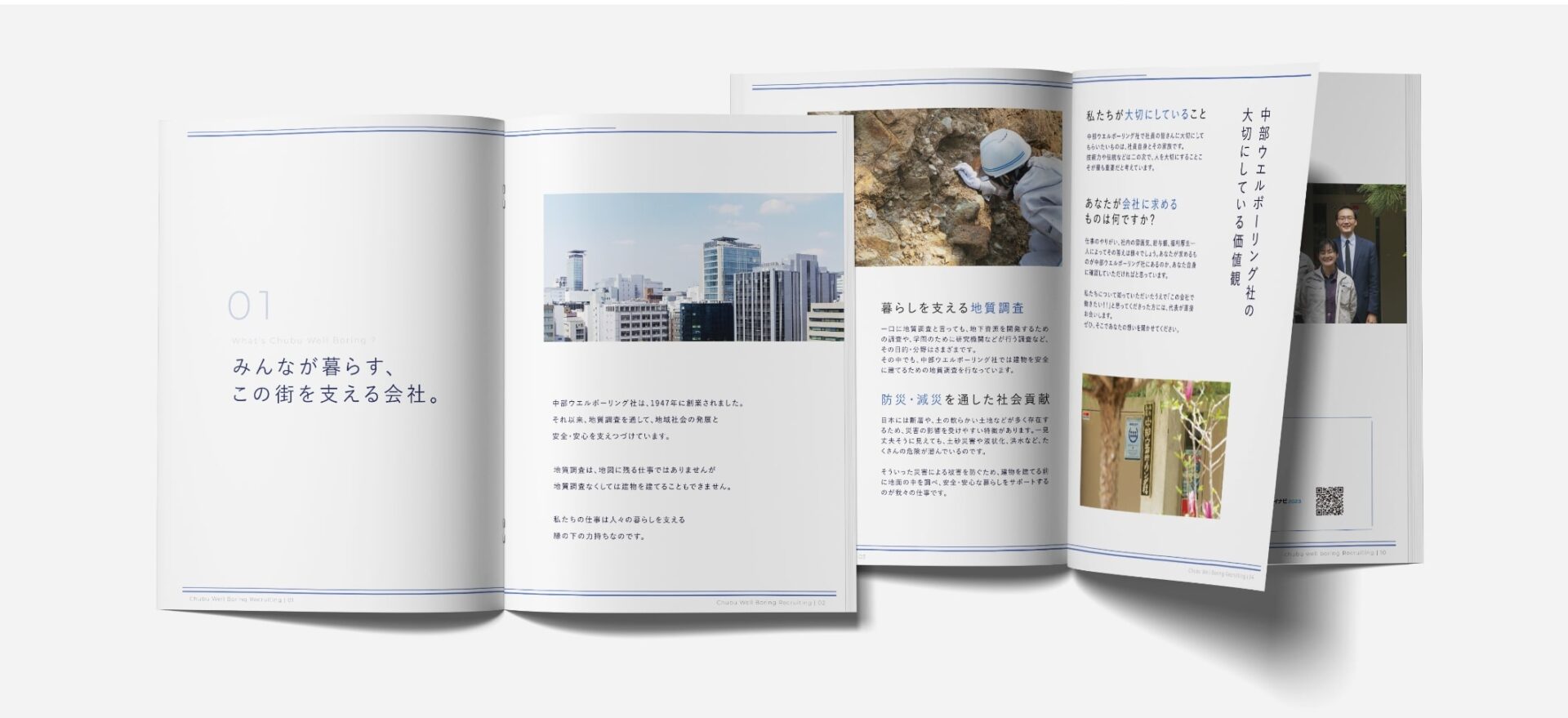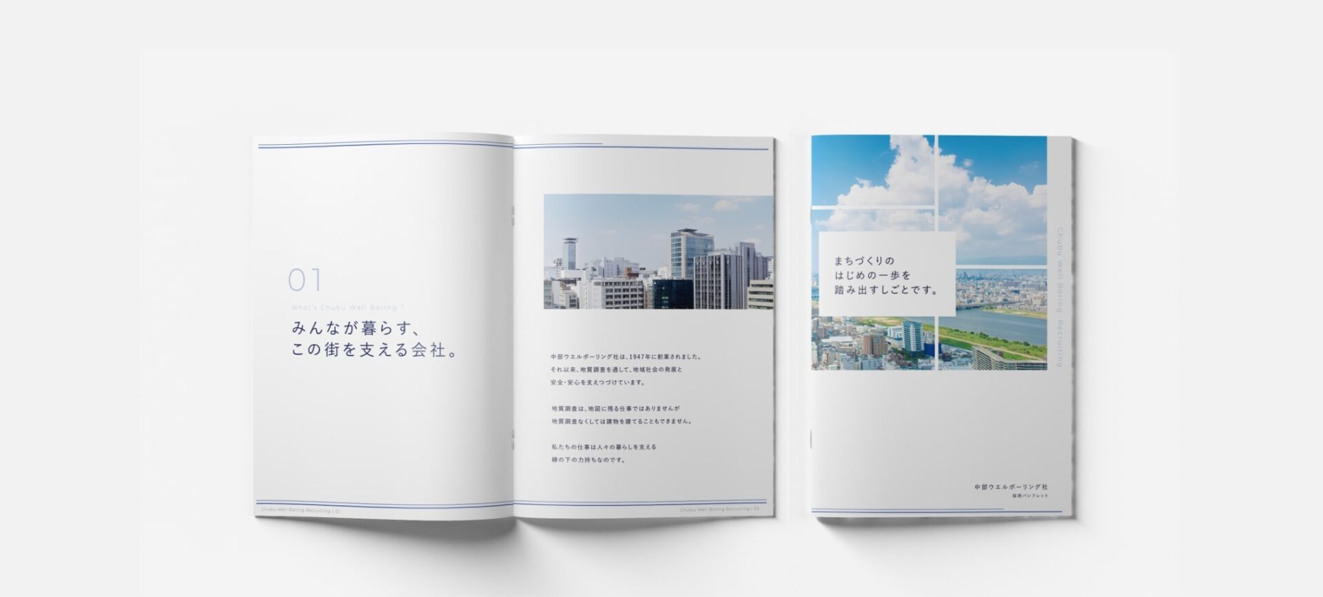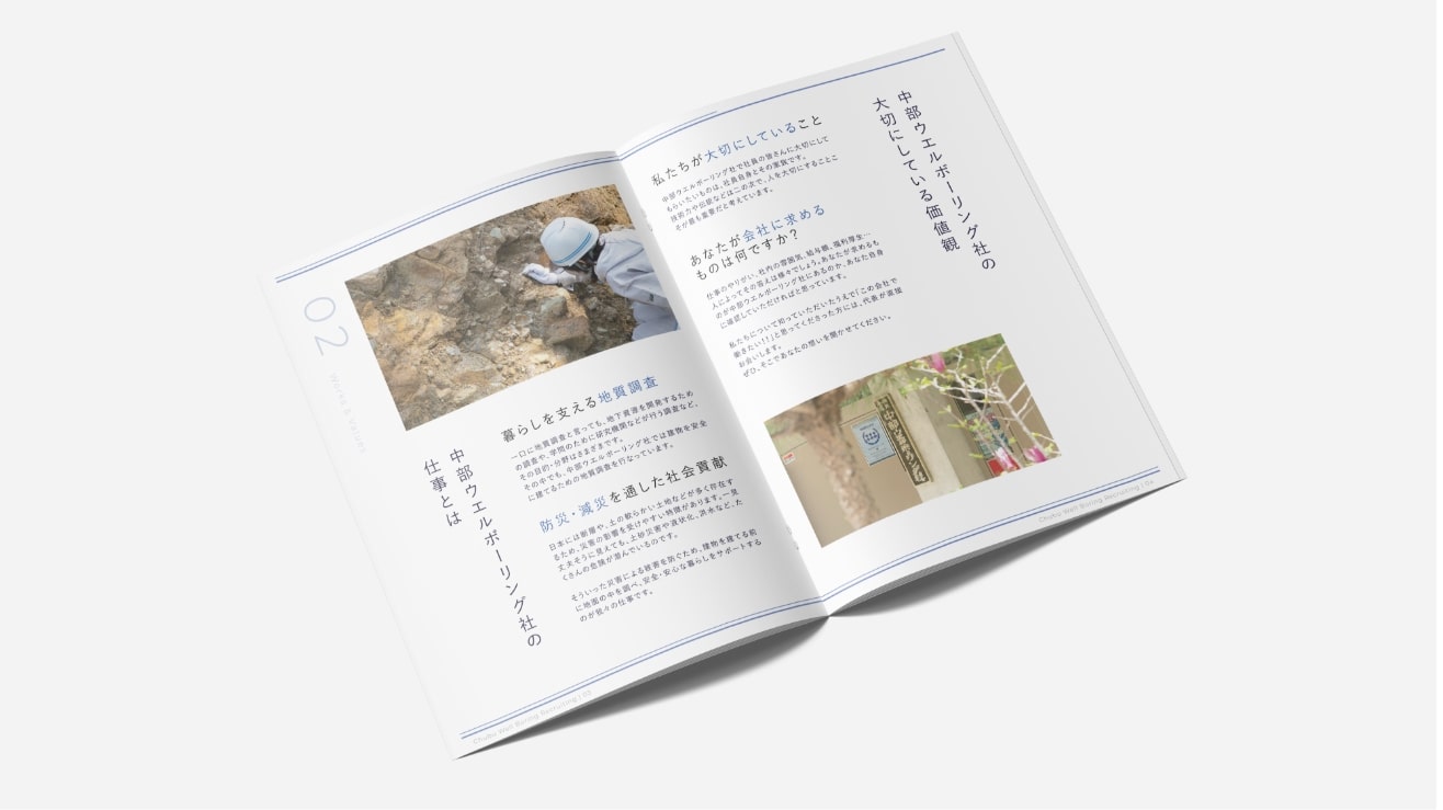 中部ウエルボーリング社様の採用パンフレットを作成させていただきました。デザインコンセプトの設計、写真撮影から納品まで担当させていただいております。