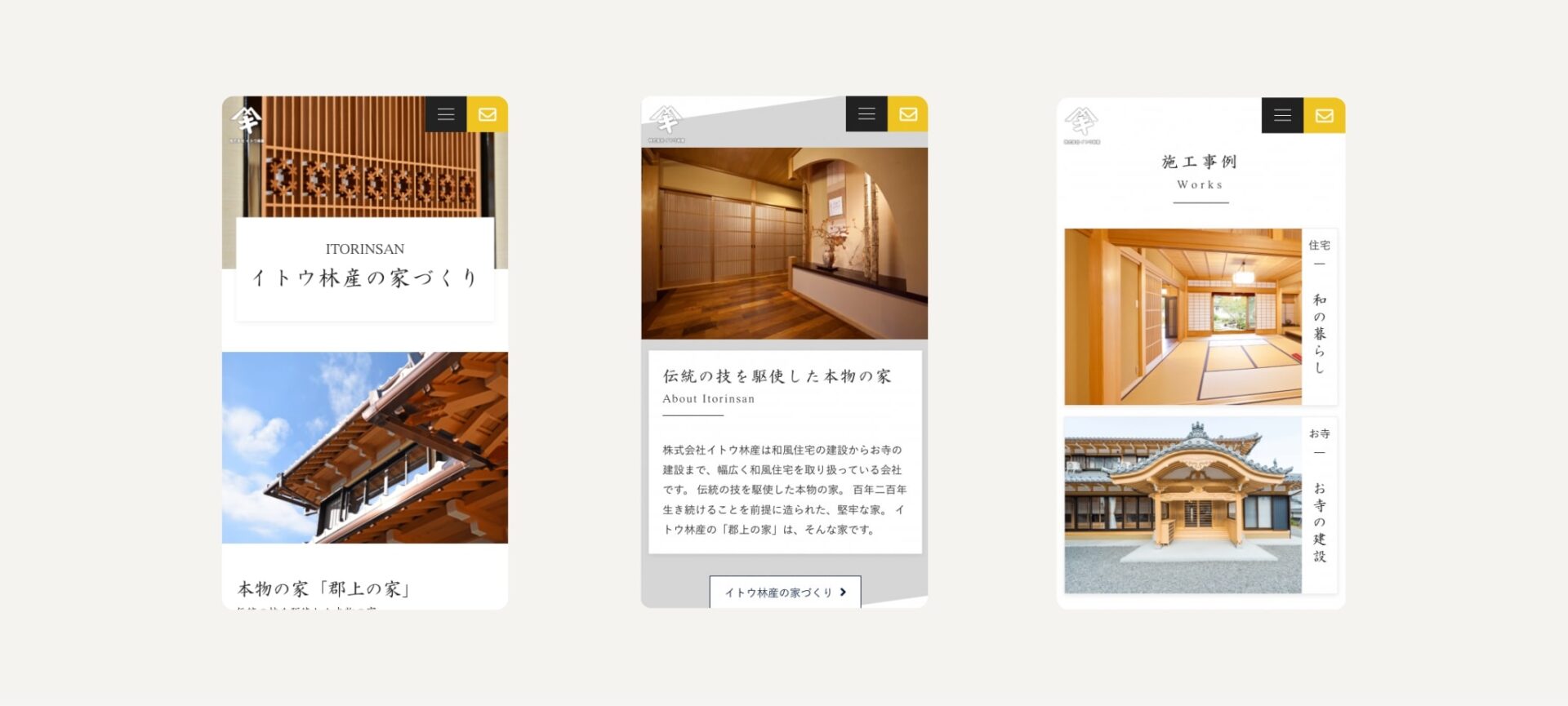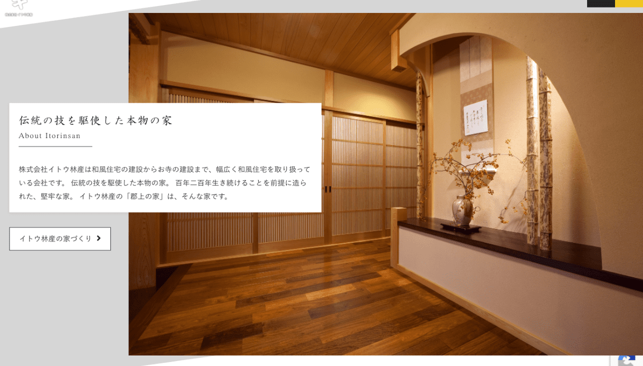 株式会社イトウ林産のコーポレートサイトを制作しました。株式会社イトウ林産は和風住宅の建設からお寺の建設まで、幅広く和風住宅を取り扱っている会社です。 伝統の技を駆使した本物の家。 百年二百年生き続けることを前提に造られた、堅牢な家。 そんなこだわりがシンプルかつダイレクトに伝わるようなデザインを心がけました。