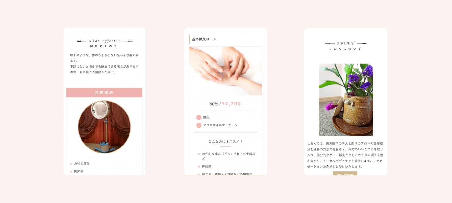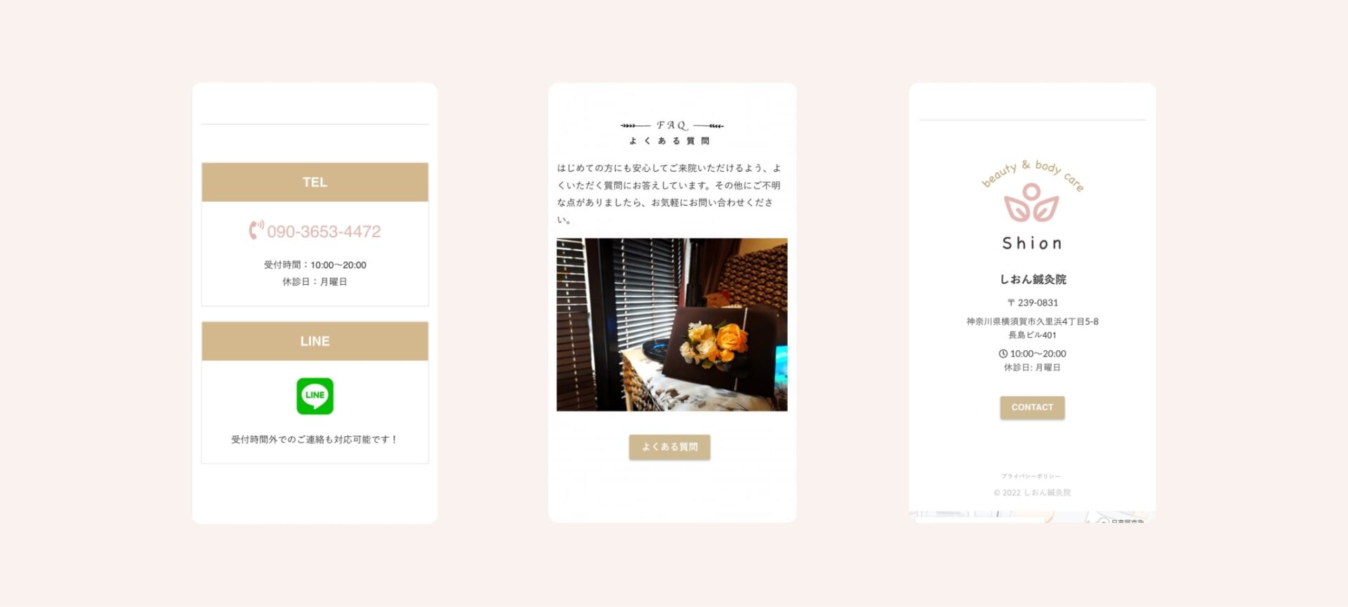 横須賀で隠れ家的なプライベート空間を提供するしおん鍼灸様のWebサイトを制作しました。 モバイルでのUXの向上を狙ったデザインとなっており、表示スピードにも配慮されています。わざわざ神奈川県よりお越しいただきありがとうございました。